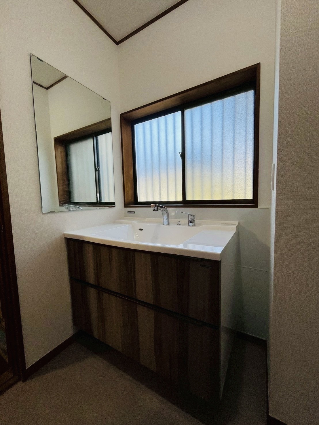 Nさまのご要望は、「掃除がしやすく収納の多い洗面化粧台」で、